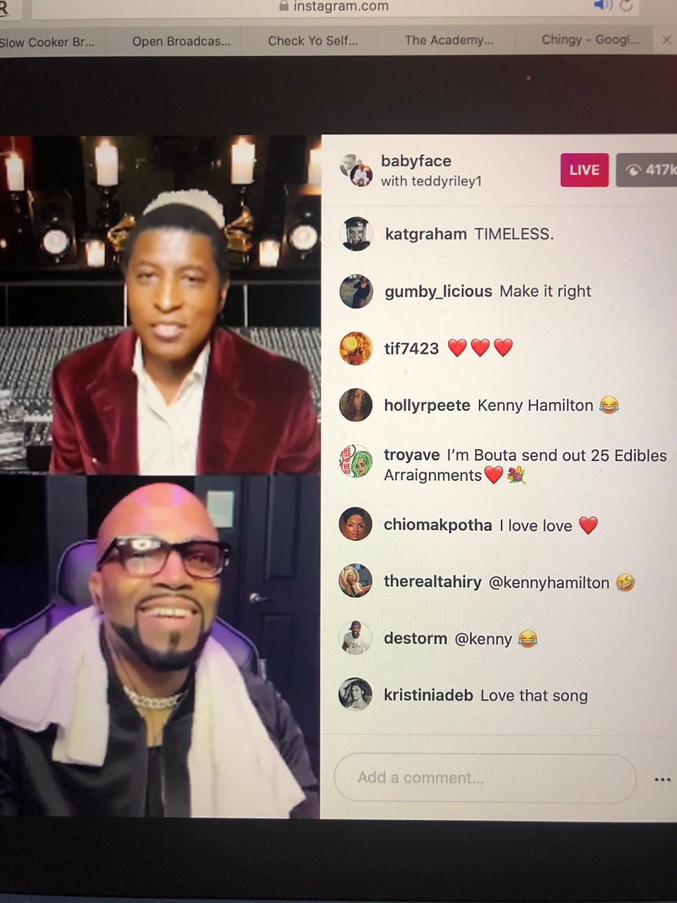 With over 500,000 people in the live, Teddy Riley is experiencing some technical issues and drops out of Babyface’s live. To keep the crowd engaged, Babyface plays The Boys “Dial My Heart.” Everyone in the comments begins asking Babyface to play the guitar, and he obliges. Just as he begins to play, Teddy Riley pops back into the live, but it was a fakeout since he could not join the live. Babyface picks the guitar back up and begins to play Eric Clapton’s “Change The World.” Teddy shows up again but still can’t get into the live. “This is crazy,” Babyface states. At this point, the hour is up, and Instagram cuts off. Babyface restarts the live, and Teddy is still nowhere to be found. At this point, Babyface informs us Teddy is unable to rejoin the live and begins to play “Another Sad Love Song” by Toni Braxton. Everyone switches to Teddy’s live, and Teddy can’t add Babyface into the live either. Teddy Riley and Babyface have broken the internet!